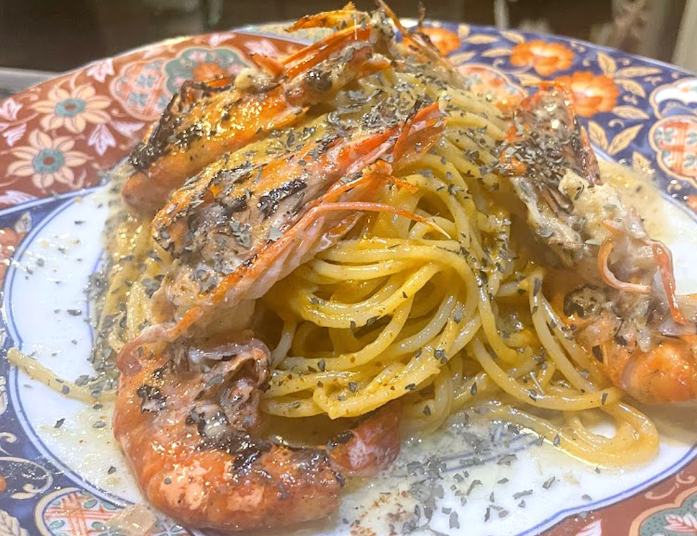 ぷりぷり食感の大海老を贅沢に使用。和風仕立てのカルボナーラは濃厚なのに後味すっきり。